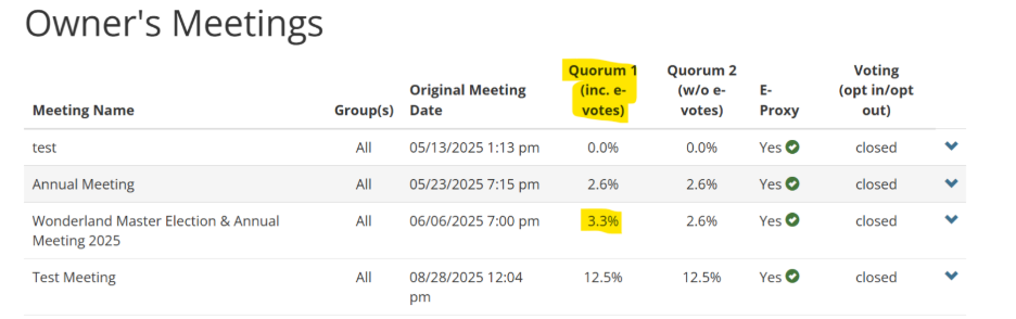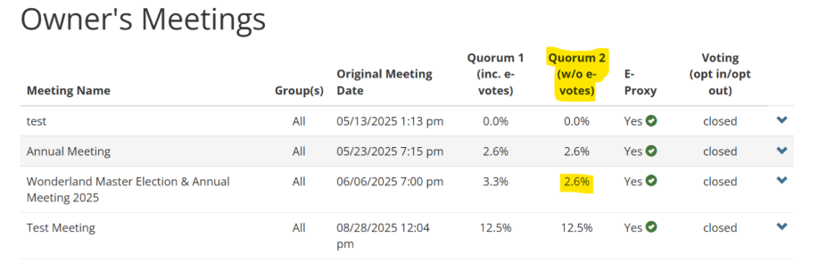 💡 Reminder: The quorum percentage displayed is always based on the ownership share that has participated, whether by electronic vote or recorded proxy.