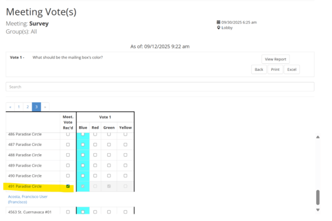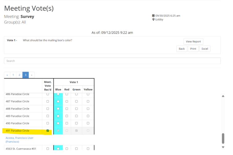 - All units in your association, with boxes showing if they voted and which option they selected.