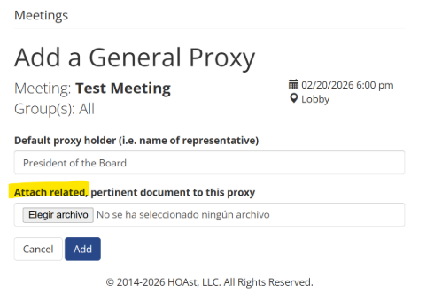 In myHOAst, you would not add the same proxy that is mailed out to owners in most situations.