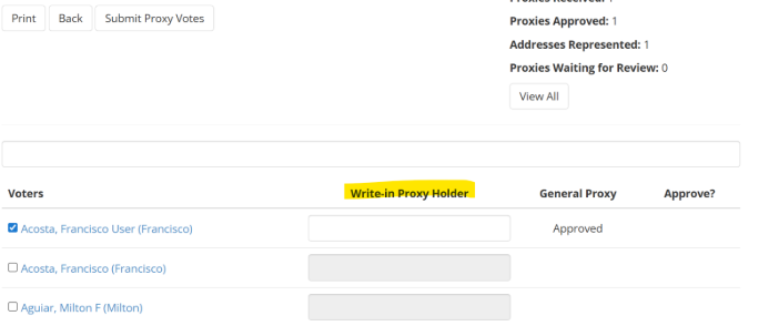 - If the paper proxy designates a different proxy holder, you can enter a write-in proxy holder to reflect that information accurately.